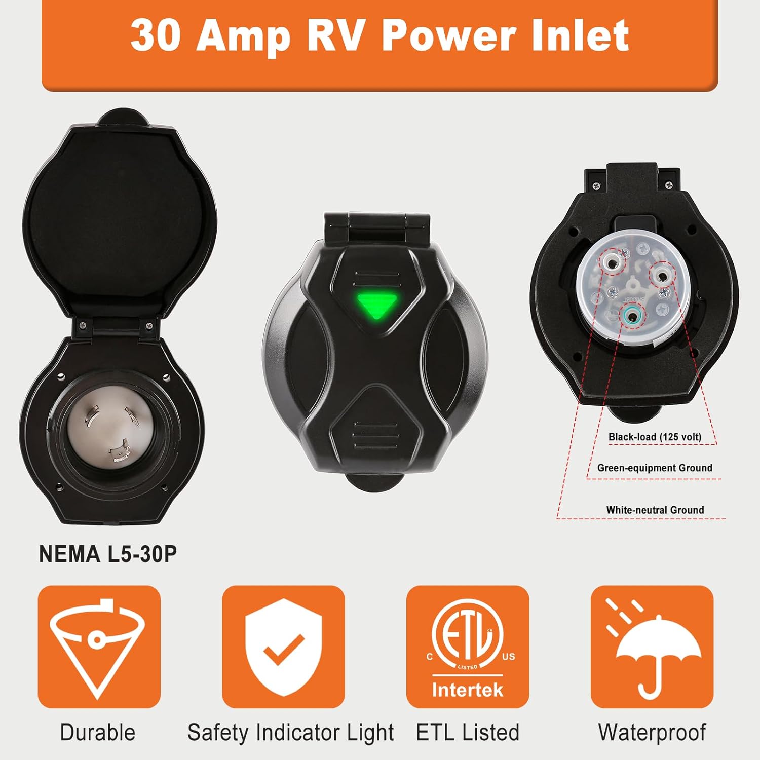 30 Amp RV Extension Cord,25 ft,Heavy Duty Generator Extension Cord with LED Power Indicator,30 AMP Female 90° Twist Lock Adapter with Reverse Polarity Lamp,NEMA TT-30P to L5-30R,120V/125V, 30 AMP RV Power Inlet Receptacle Power Plug with Indicator,125V,Female Twist Locking Connector with Weatherproof Cover Boot Kit for RV Trailer Boat Caravan Camper,NEMA L5-30R Black Plug
